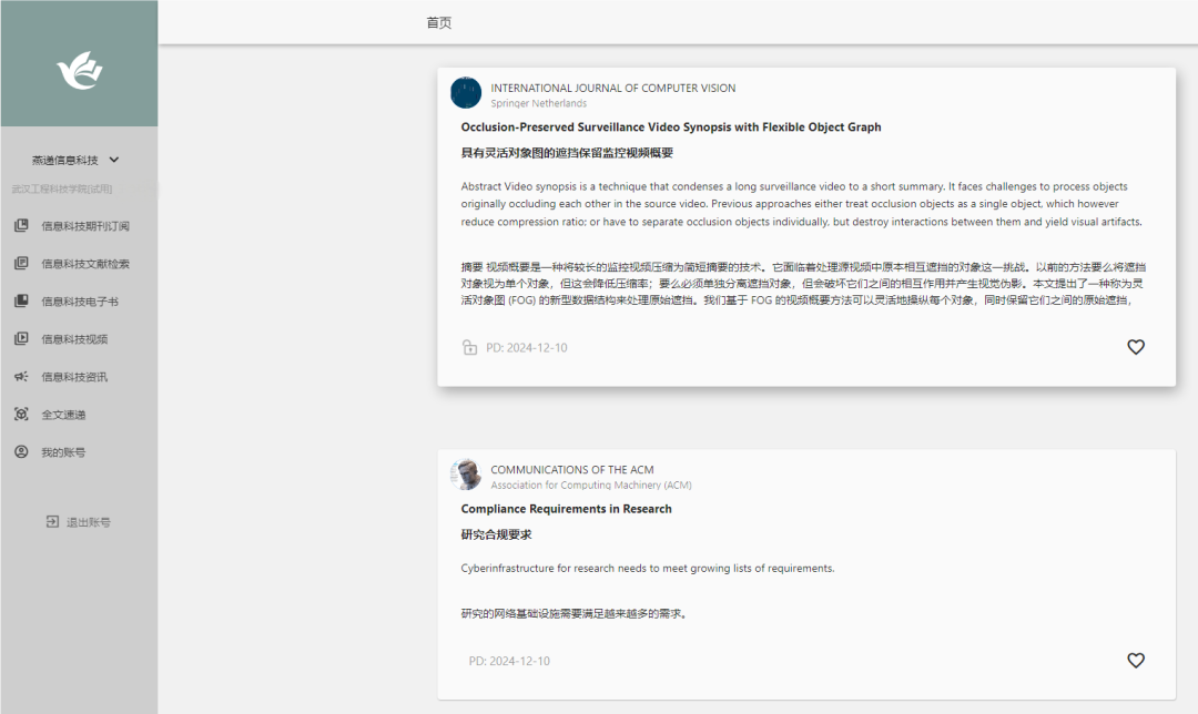 信息科技:可订阅期刊2077种;视频近4000段;信息科学图书1.5万余册;可检索文献量2500万篇;专业领域内的实时更新资讯等。