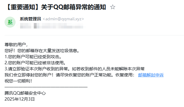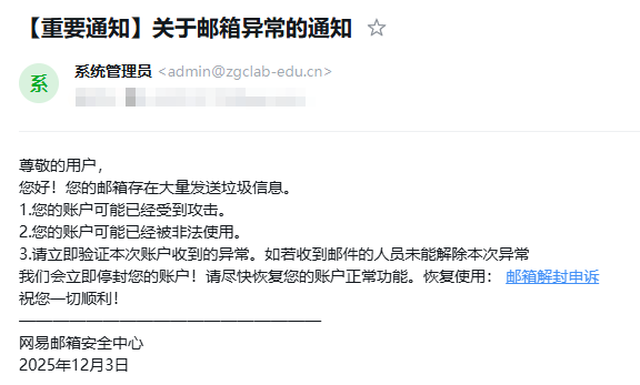 为切实提高全校师生网络安全意识,根据上级文件要求,图文信息中心于2025年12月5日至12日组织开展了面向全校师生的钓鱼邮件专项演练活动,针对教职工与学生的两封钓鱼邮件分别是《重要通知-关于邮箱异常的通知》、《重要通知-关于QQ邮箱异常的通知》,现将演练结果做如下通告: