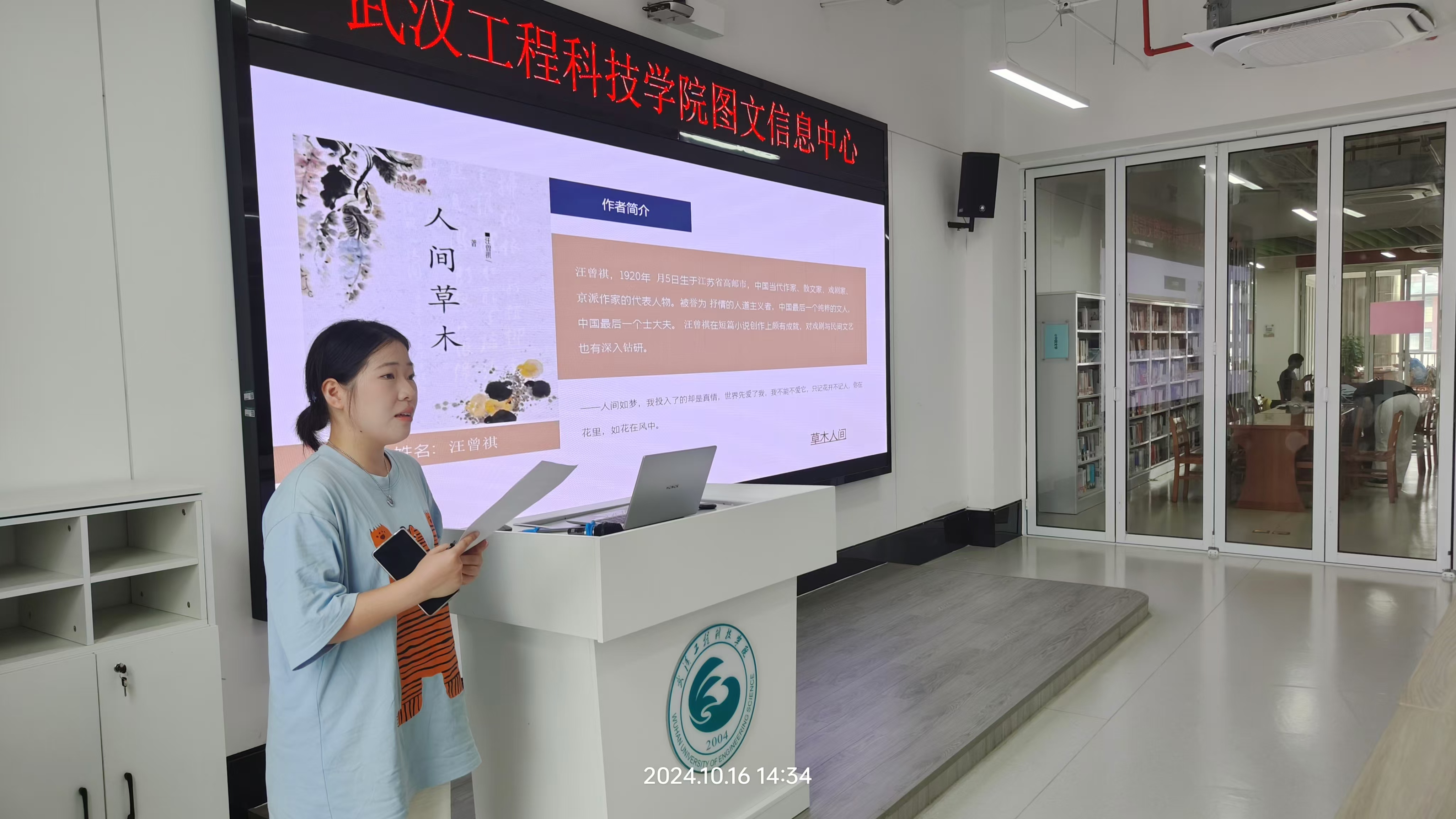 10月16日下午,由图书馆主办的第二十二期博雅读书会在图书馆三楼培训教室成功举办。本场读书会以汪曾祺先生的《人间草木》为阅读书目,由机械与工程学院夏宇涵同学领读,图管会策划外联部王涵主持,为参与活动的爱书之人带来了一场心灵的盛宴。