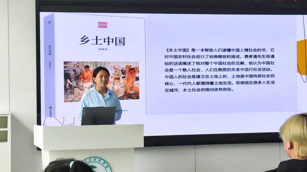 她全面介绍了《乡土中国》这本书的内容简介、作者简介、写作背景,让在座同学对整本书有了大概的印象。随后重点讲述了她在阅读这本书后的收获与感想。