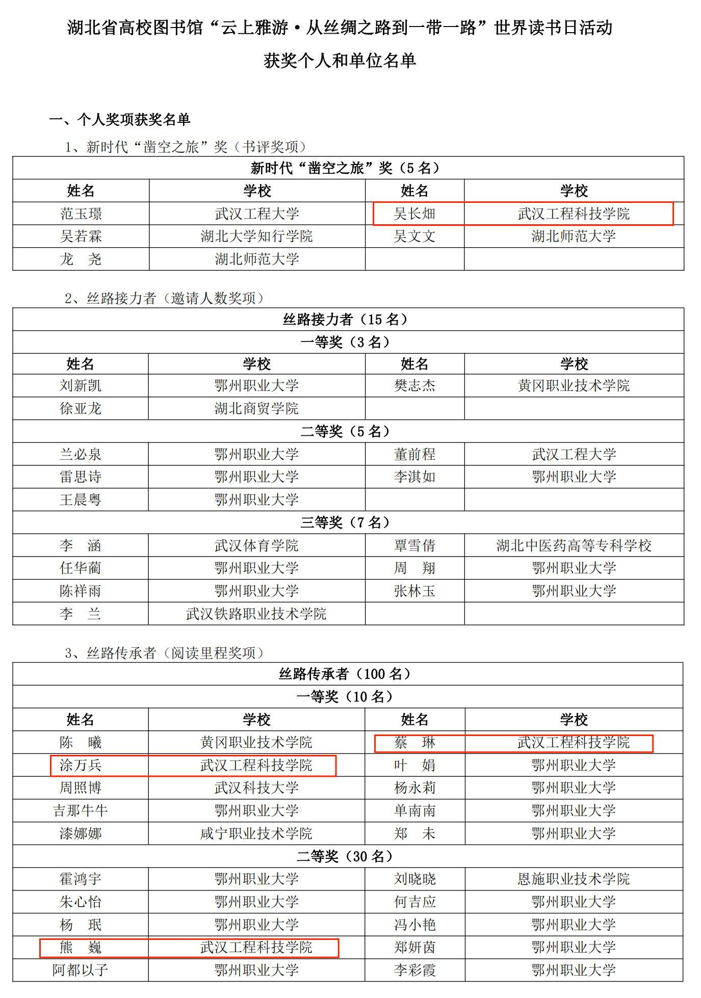 近日,湖北省高校图书馆“云上雅游·从丝绸之路到一带一路”世界读书日活动获奖结果公布,我校师生在本次活动中获得奖项7项,其中,书评比赛获奖1项,线上阅读比赛获一等奖2项,二等奖1项,三等奖1项,优秀组织奖1项,优秀指导老师奖1项。