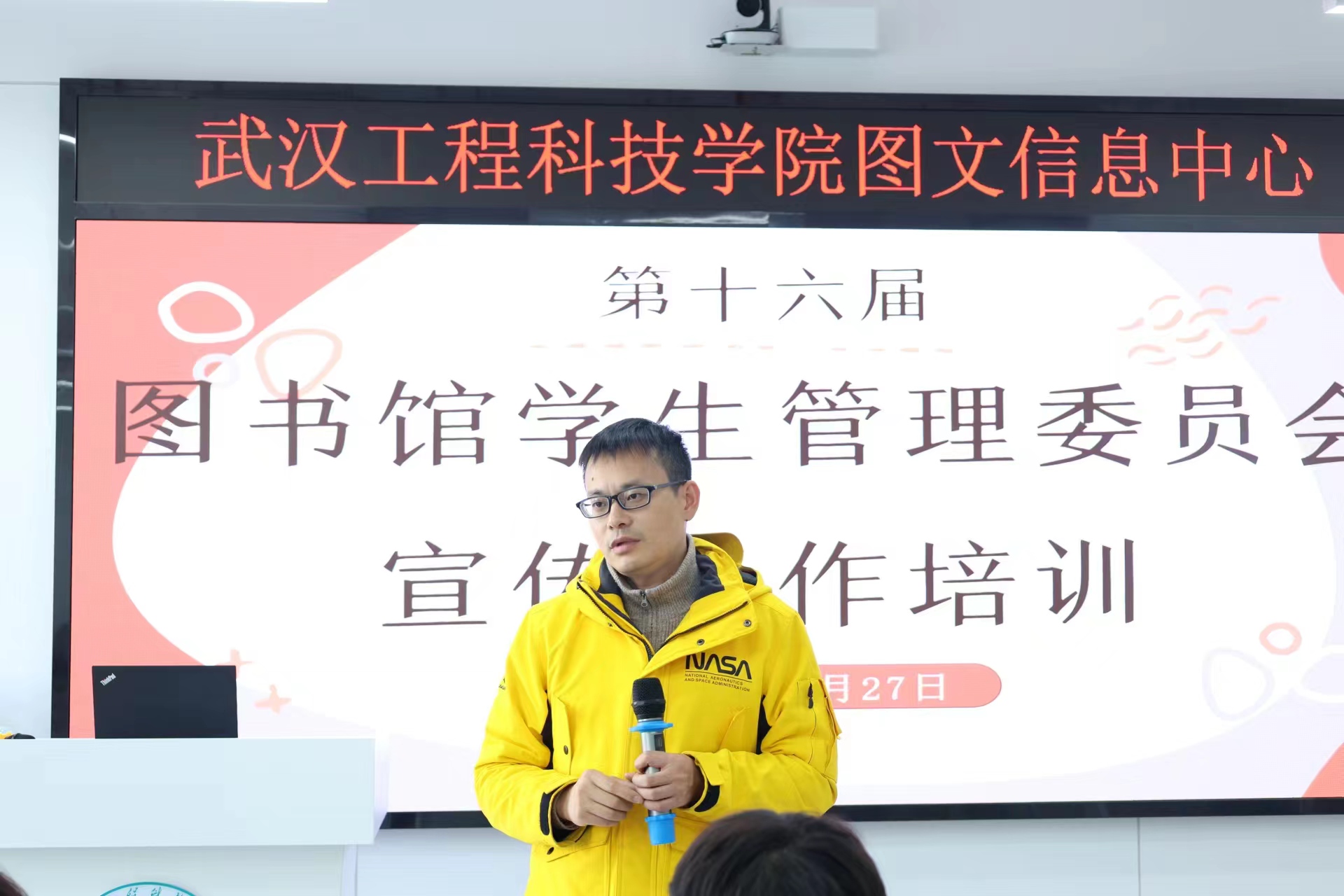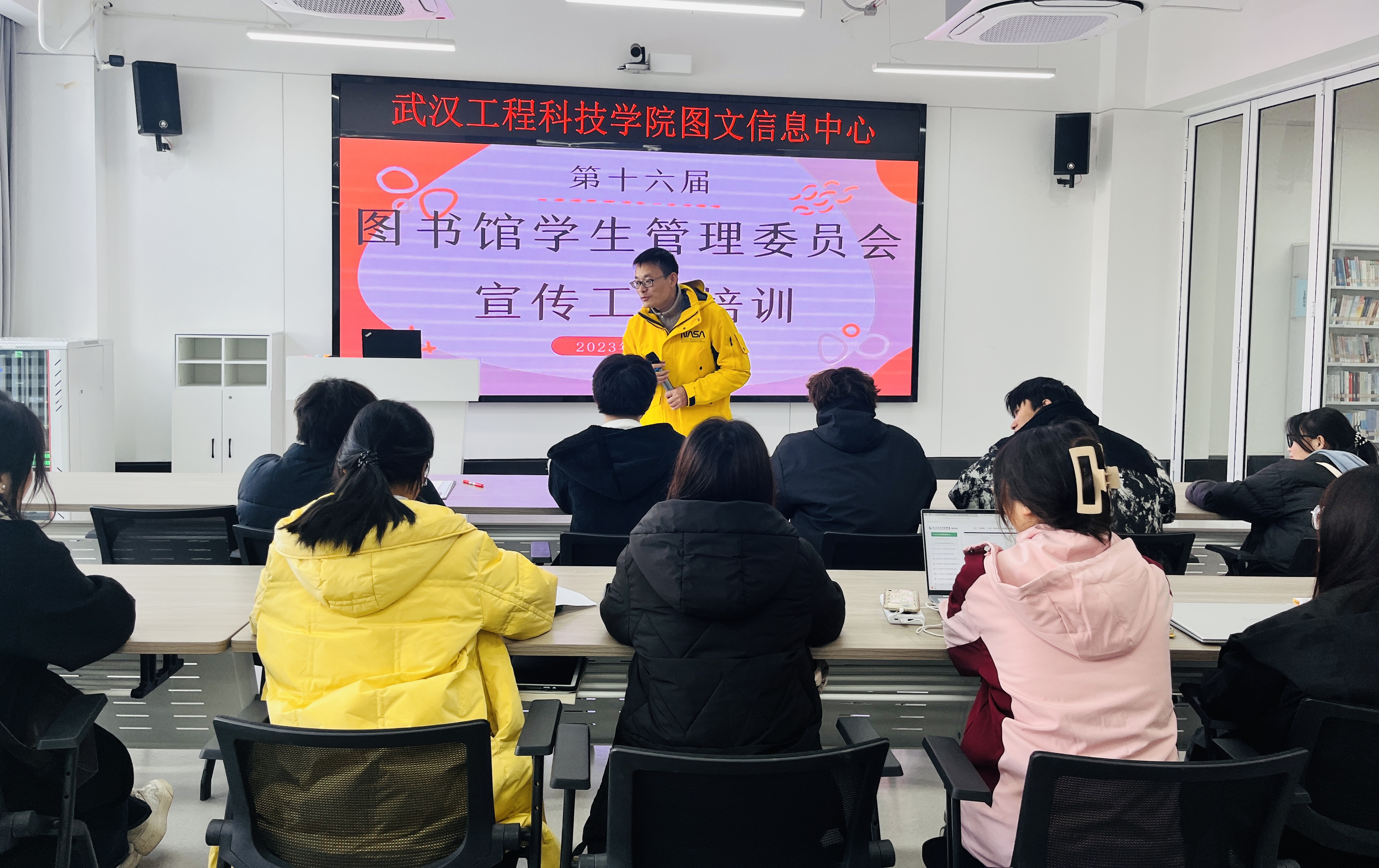 为进一步提升图书馆学生管理委员会(以下简称“图管会”)学生队伍的整体素质,提升图书馆工作的宣传质量,图文信息中心于11月27日下午在图书馆三楼培训教室举行了宣传工作培训。会议邀请了学校党政办公室宣传中心主管邵国超老师主讲,图管会指导老师王会玲及图管会部分学生参与了此次培训。