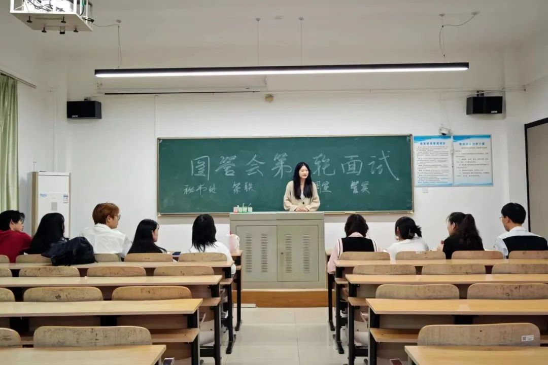 第一轮面试按照同学们的课程安排分成了两组,于10月11日下午和晚上在图书馆三楼培训教室分开进行。图管会各部门部长出席并担任面试官。面试有近70名同学参加。参与学生依次进入教室,自信大方地做了自我介绍,部分同学还通过展示自己的特长以及兴趣爱好介绍自己,来表明想要进入图管会的决心。接着,各部门部长根据本部门工作性质和工作重点有针对性地提出问题,考察同学们各方面的综合能力。通过部长提问环节,让新老同学彼此之间有了进一步了解。