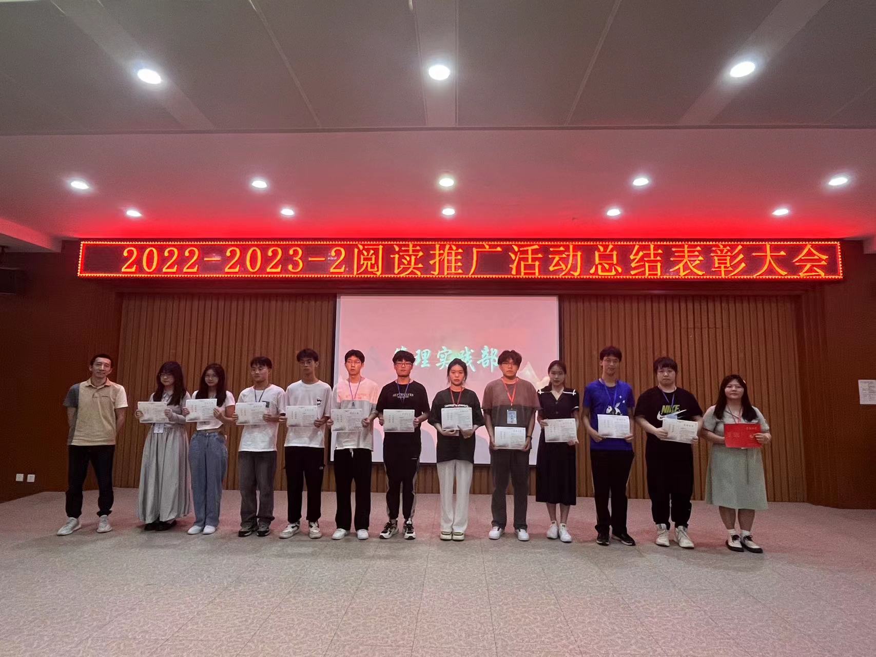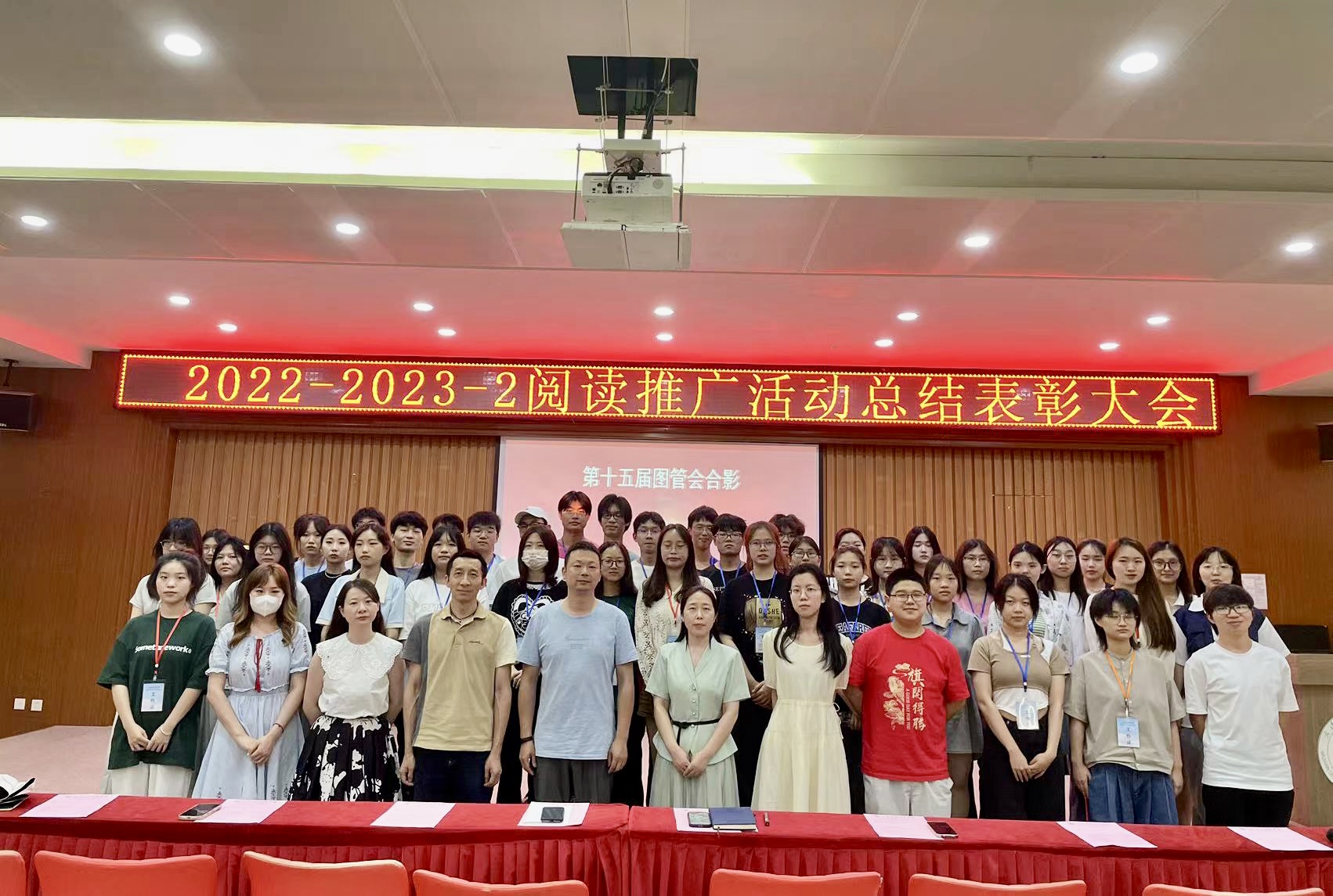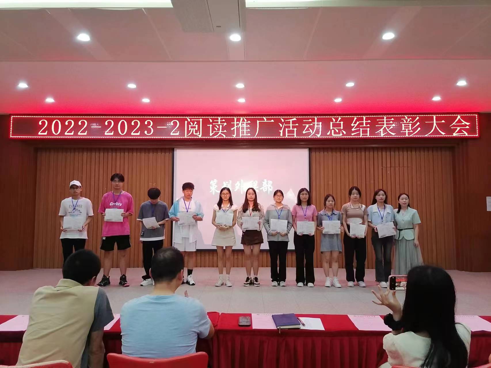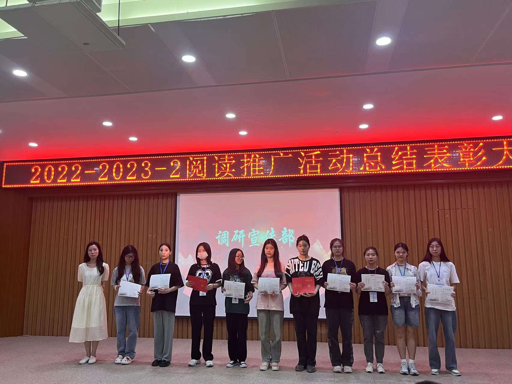 6月15日中午,图书馆2022-2023-2学期阅读推广活动总结表彰大会在事务中心311报告厅举行。出席此次会议的有图文信息中心主任周博、人文学院中文系主任杨敏艳老师、艺术与传媒学院播音与主持专业姚钧浩老师、图书馆学生管理委员会(以下简称图管会)指导老师王会玲老师以及图文信息中心图书馆业务的所有老师,会议由图管会秘书处毛涵竹同学主持。