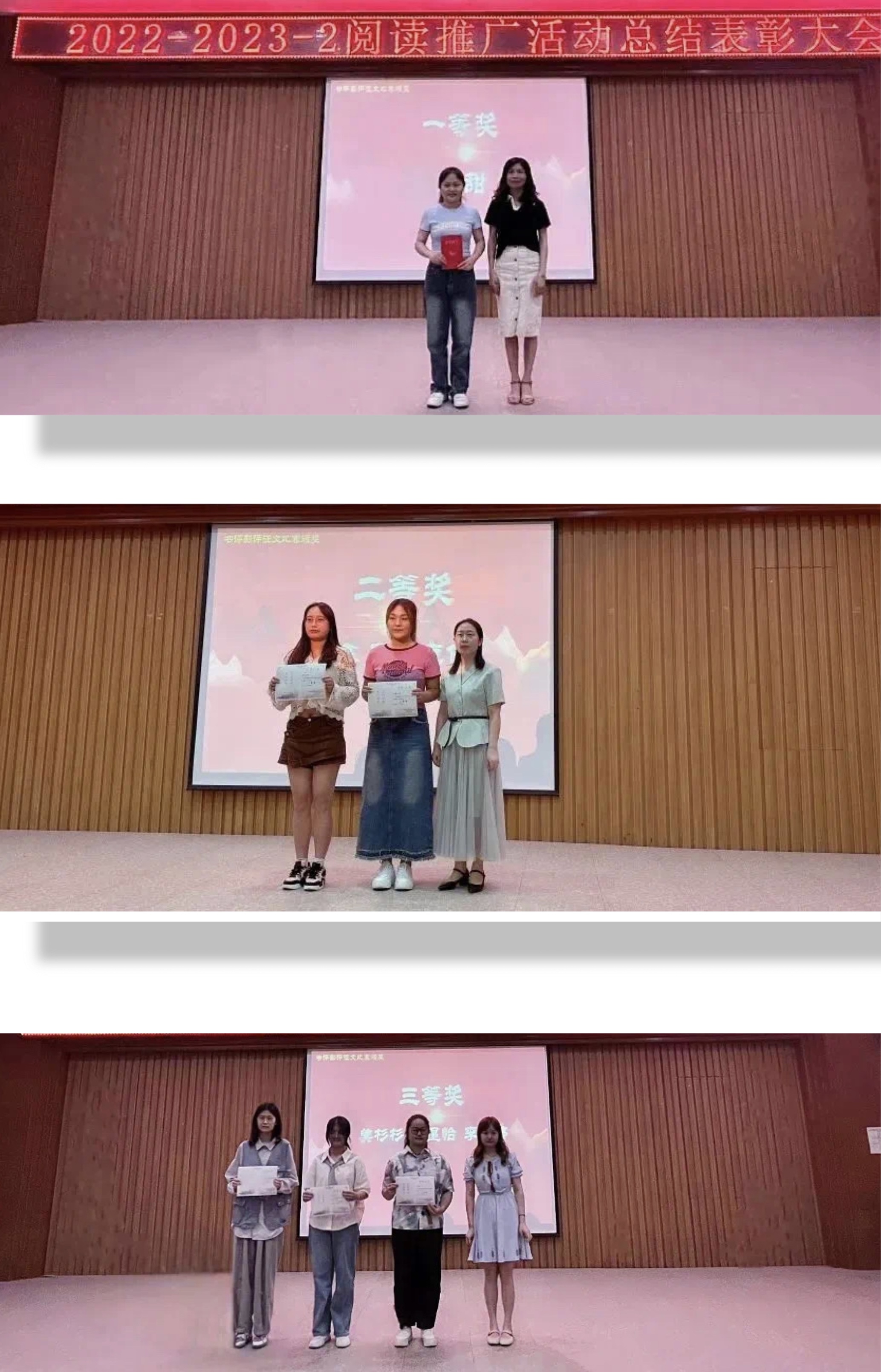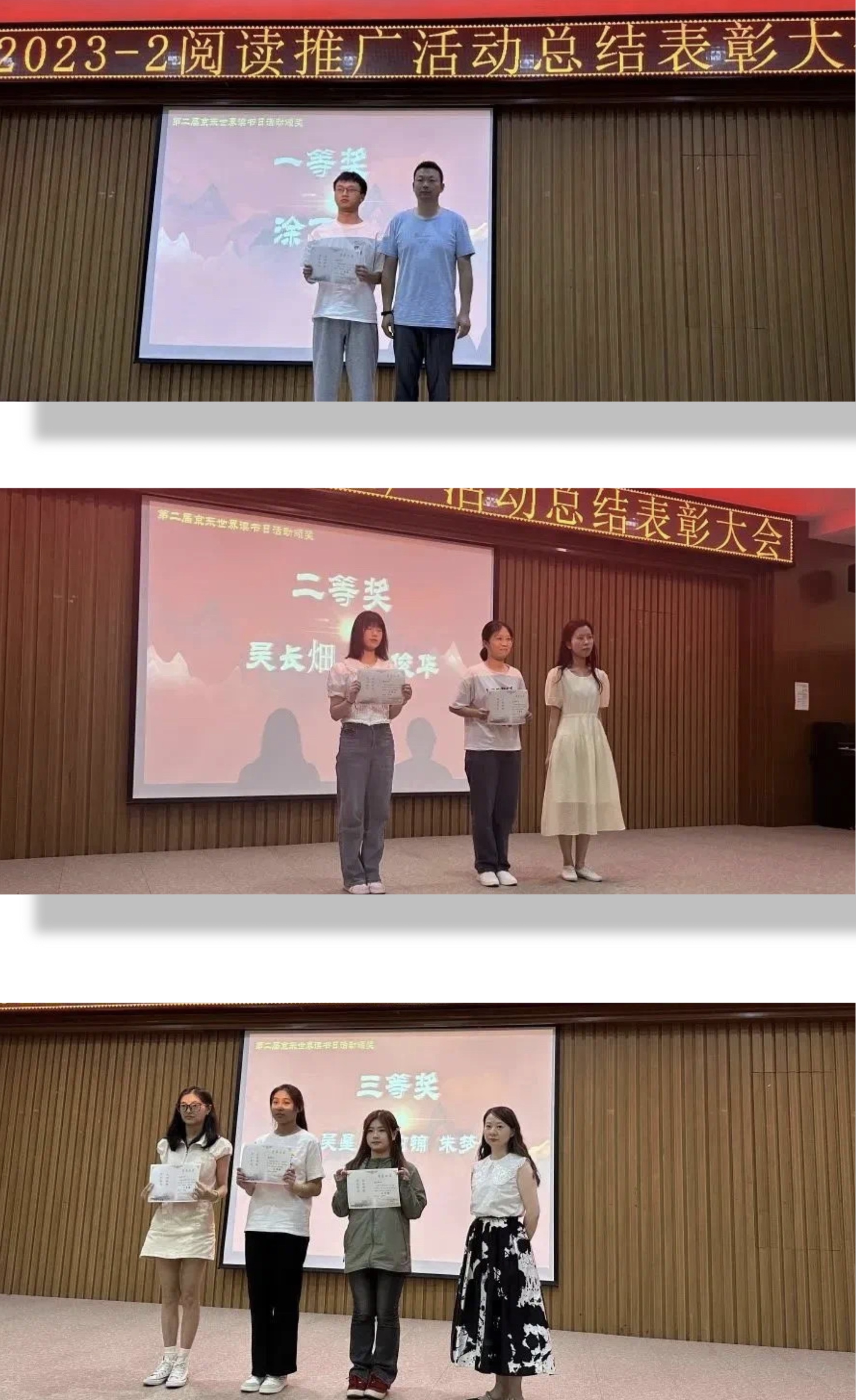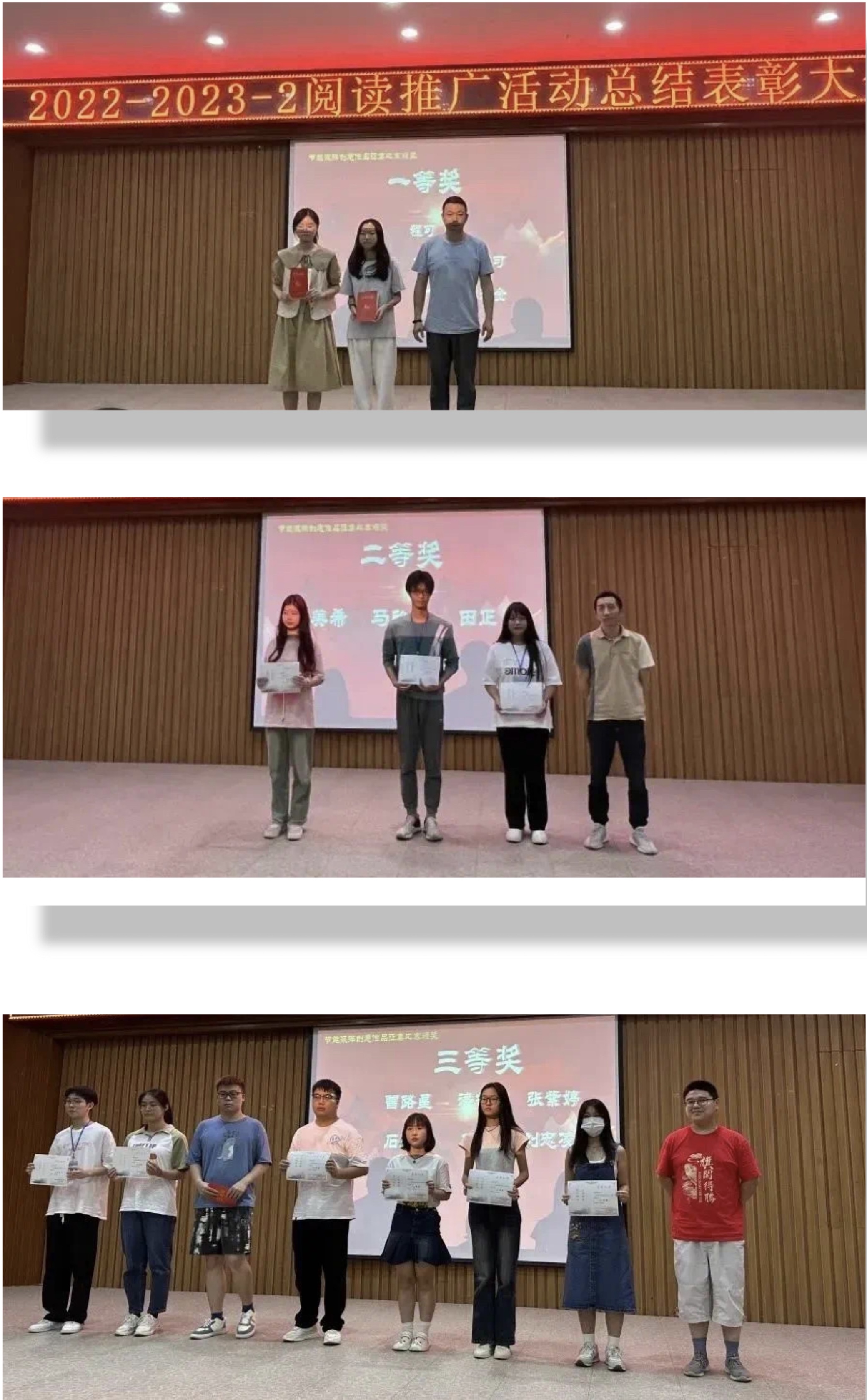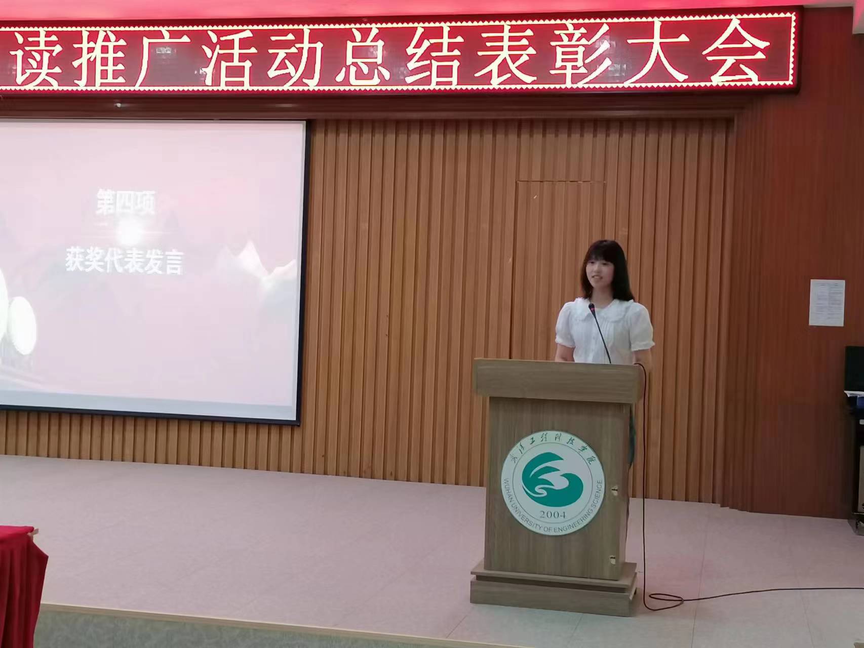 随后为阅读活动中获奖的学生进行颁奖。在座领导与嘉宾分别为“节能减排”创意作品征集活动、“云上雅游数字奇遇·探‘悦’之旅”世界读书日活动、第四届湖北省高校图书馆书评影评征文比赛校内初赛和读书清音活动颁奖。
