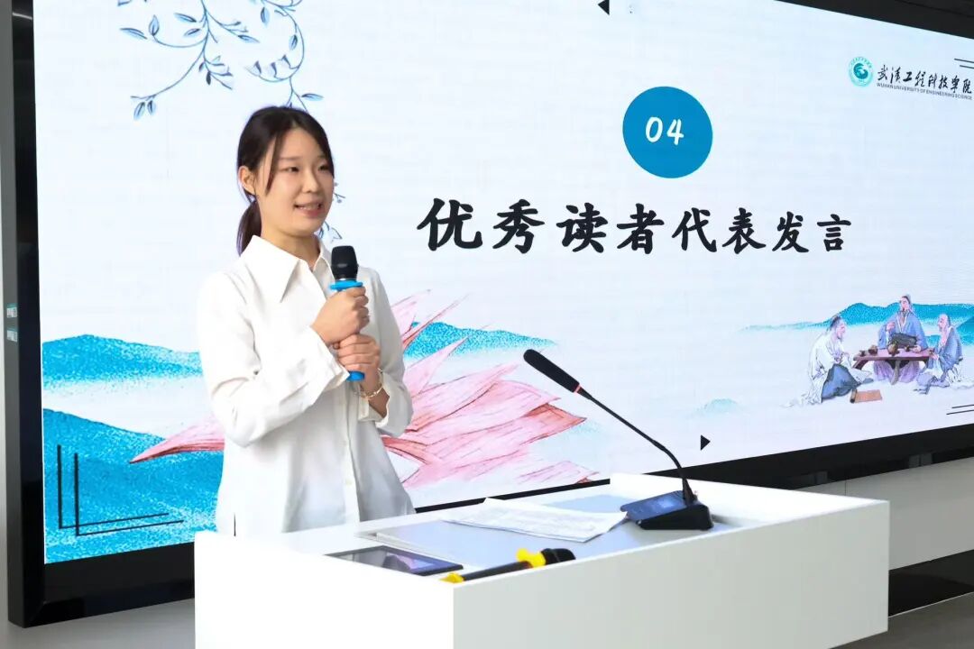 优秀读者代表、人文学院2024级汉语言文学专业刘佳瑶上台发言。她表明,大学成长路上难免迷茫,图书馆是学子静心求学、安顿身心的温暖栖息地。她指出,图书馆不仅藏书丰富、阅览环境优良,更陪伴学子成长成才。她介绍,学校各类读书主题活动形式丰富、内涵深厚,让自己在阅读与交流中收获成长。她表示,图管会师生服务贴心尽责,后勤工作人员默默坚守,为全校师生营造了整洁舒适的阅读学习环境。她感谢图书馆全体老师与工作人员的辛勤付出,希望全体同学坚持阅读、勤学善思,在书香滋养中不断成长进步。